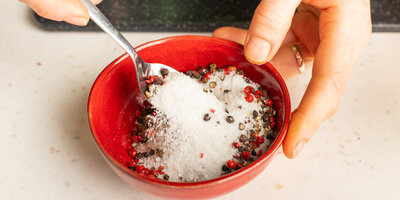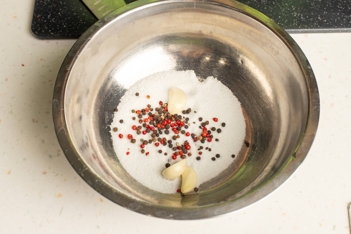 Smíchejte 1/2 soli a 1/2 pepře v nádobě, sklenici, pánvi – jakékoli nakládací nádobě, kterou lze pevně uzavřít a dát do lednice.