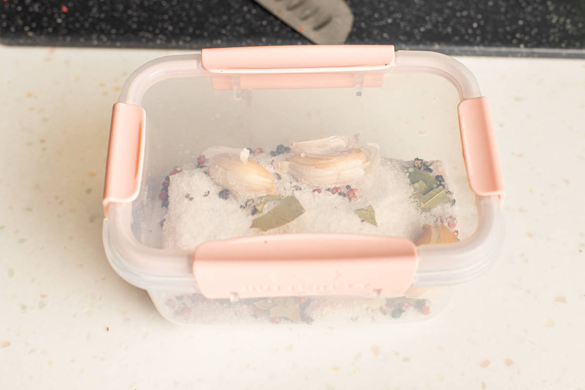 Pátý den sádlo vyjmeme, setřeseme přebytečnou sůl a koření. Vložte jej do těsného sáčku nebo kompaktní nádoby a vložte do mrazáku. Nejlépe přes noc. Připraveno. Osolené sádlo skladujeme v mrazáku.