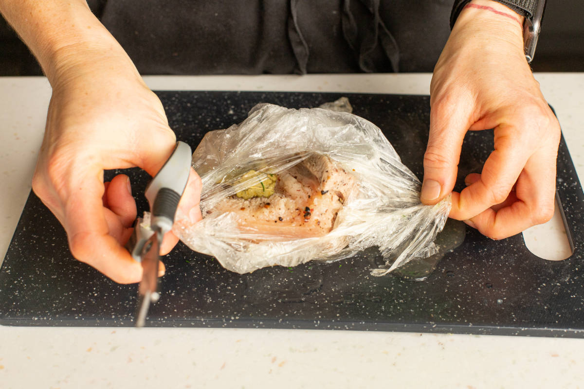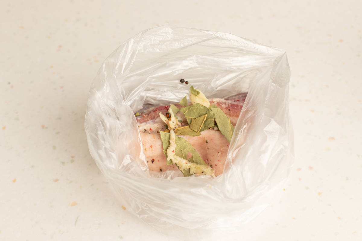 Vložte do těsného sáčku. Je lepší vzít pečicí návlek, aby to byl určitě potravinářský plast vhodný do vysokých teplot.