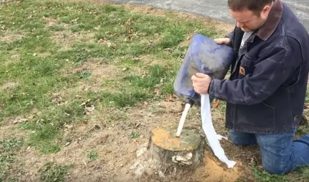 Abyste to udělali, měli byste do něj nejprve vyvrtat několik otvorů velkým vrtákem, nasypat do nich sůl, naplnit vodou, celou „konstrukci“ zakrýt celofánem a na její existenci na rok a půl zapomenout. Během této doby sůl zničí strukturu dřeva a pařez lze snadno a jednoduše vykořenit sami bez cizí pomoci.