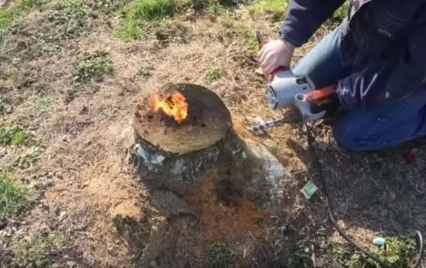 Zatímco pařez hoří, měli byste udělat ještě několik šikmých otvorů na různých stranách pro přívod vzduchu. Poté vynaložíme veškeré úsilí, abychom zajistili, že pařez začne stabilně hořet. Asi po 4 hodinách by mělo být patrné hoření základny. Pařez bude ještě dlouho doutnat. Asi po 8-10 hodinách by na jeho místě nemělo zůstat nic kromě malého kráteru.