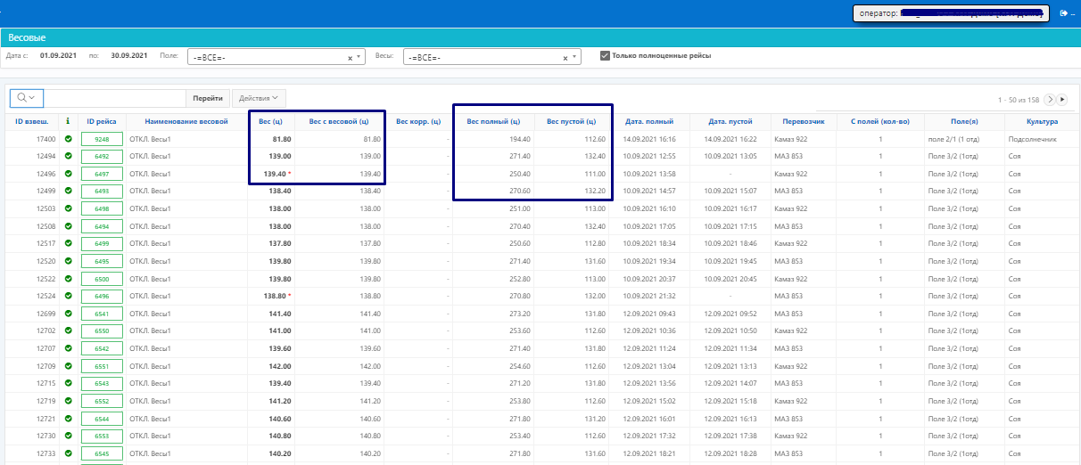 Systém zaznamenává dva momenty vážení: plný a prázdný. Na základě toho se vypočítá konečná hmotnost sklizně.