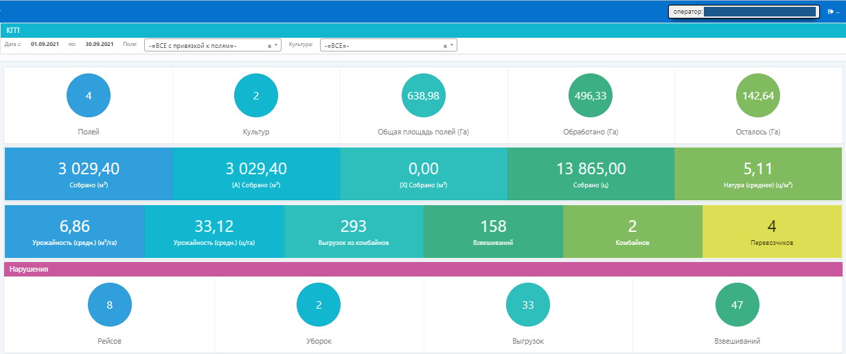 Hlavní ovládací panel obsahuje základní informace o průběhu sklizně: počet polí, kombajnů, vykládek, objem předpokládané a zpracované plochy atd.